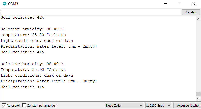 Thirdly, another problem is the soil moisture sensor. It works fine on its own and also when the other sensors are connected to the ESP32 board. But the results can only be represented properly, if the soil moisture sensor values are printed separately from the other results. If printed together with the other sensor readings, it is not printed correctly and also disturbs the arrangement of the other printed results. This is a bug we could not fix properly on our owns.