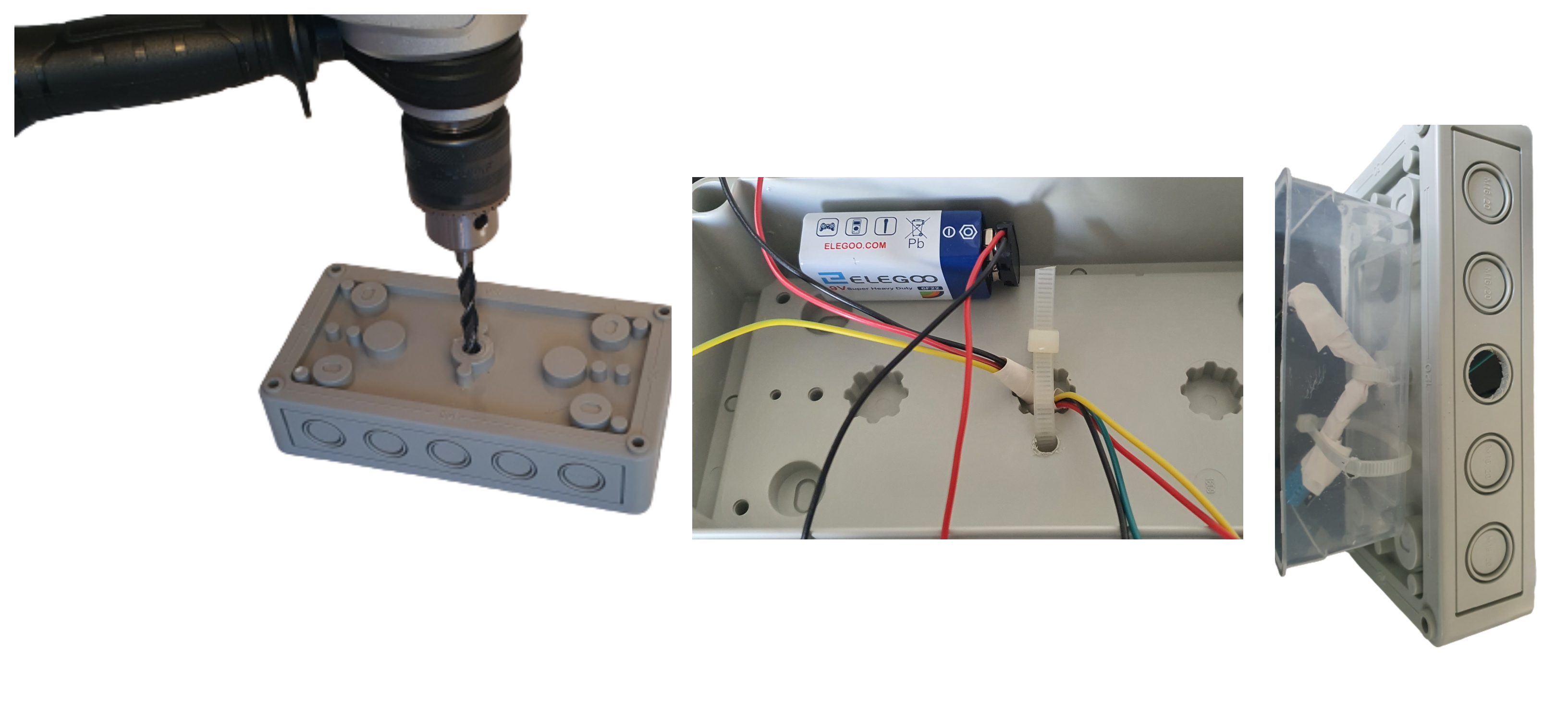 To connect the DHT11 and the GY-906, we made an 8 inches hole in the bottom of the plastic box using an electric screwdriver to pass the wires to the outside, make them hang from the box, and protect them from the rain.