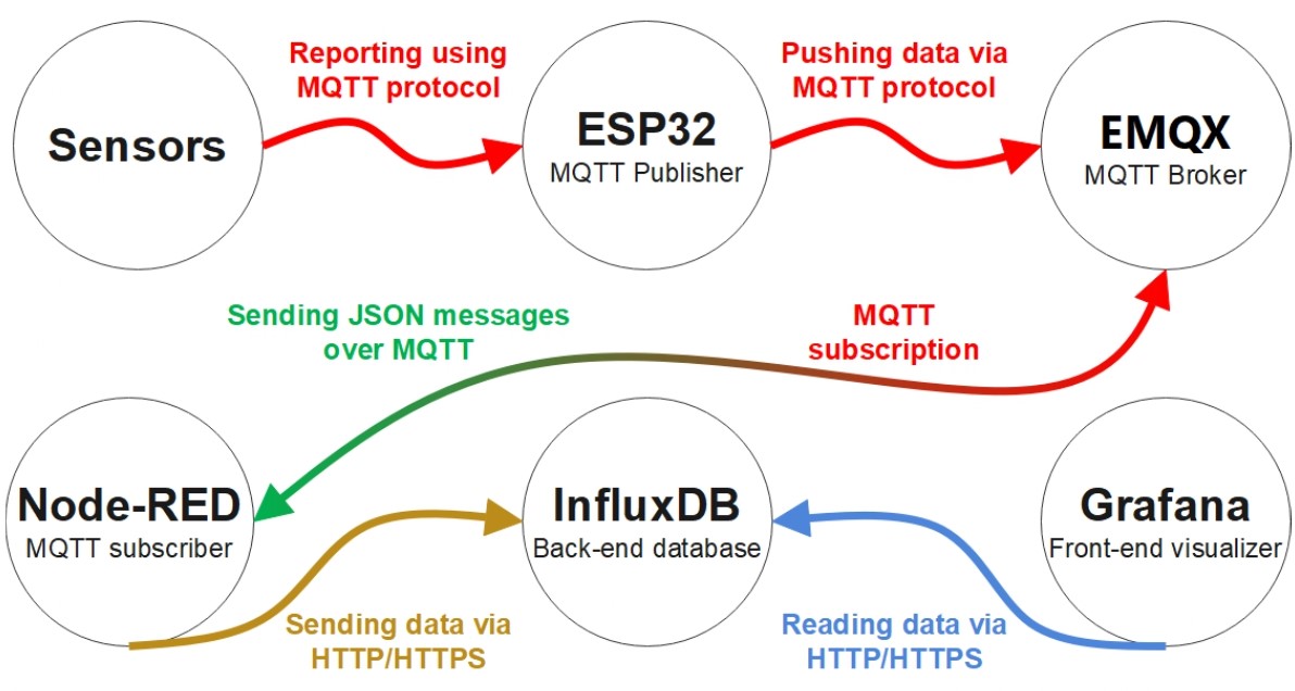 The target is to collect data from the sensors and visualize them in graphs using Grafana. There is a series of steps for each sensor connected to ensure that the data is received by ESP32, processed by Node-RED, stored in InfluxDB, and then charted using Grafana. A repeated automated process, as shown in the figure below.