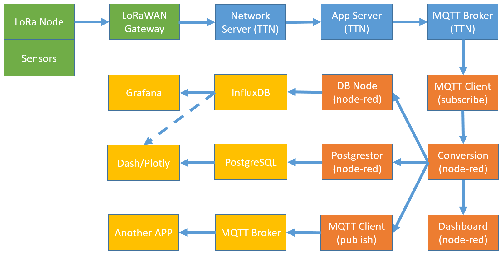The project uses Node-RED as one main system subscribing to the sensor data topics provided by the TTN MQTT broker. Node-RED is ideal to branch the message stream, to convert the data and to redistribute it further, e.g. to different databases, dashboards or other applications. The transformed messages can even be republished again enabling other systems to subscribe to it.