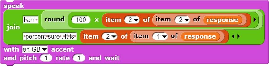 Inside analyze block we compare the class name with preset class names of food, that our pets consume, and broadcast to them. In case if the detected object is not suitable for any of them, we run speak block to pronounce the name of the object.